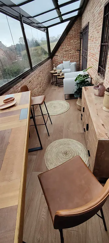 Por último, en la terraza de la habitación, se instaló un suelo porcelánico con imitación a madera, similar al de las habitaciones, después de nivelarlo con cemento debido a la presencia de sumideros para la evacuación de agua de lluvia. Esta terraza también fue cerrada con cristal, ofreciendo un acabado coherente con el resto de la reforma.