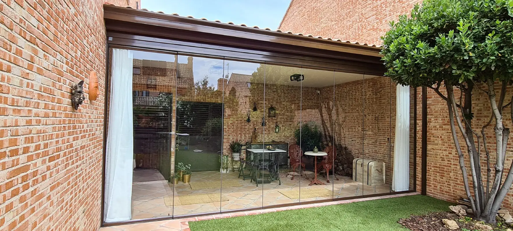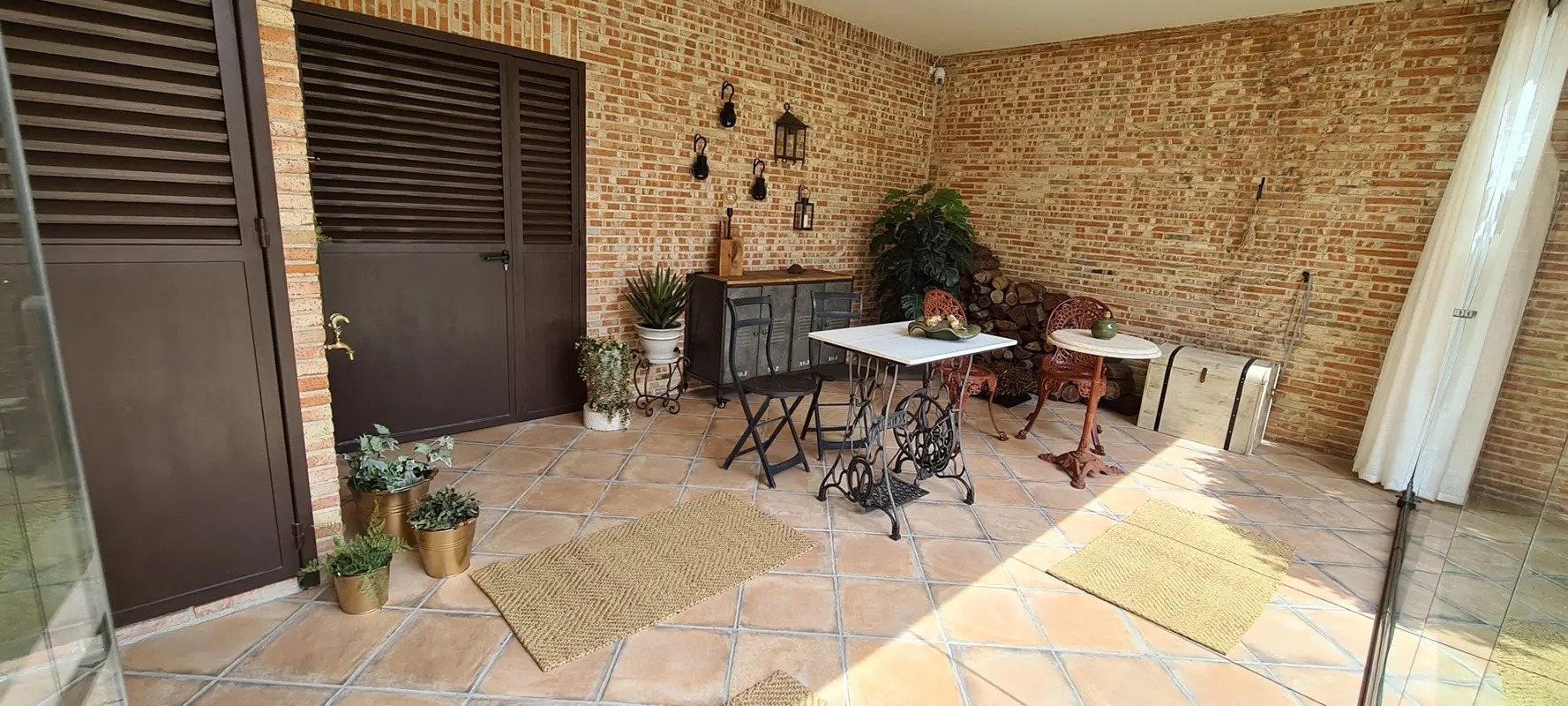 En el porche del salón, se continuó con el mismo suelo porcelánico, extendiéndolo también por la acera que conecta ambos espacios. El techo de escayola, que estaba muy deteriorado por filtraciones de agua, fue sustituido por el mismo material utilizado en el porche de la cocina. También se añadieron puntos de luz y se procedió al cerramiento con cristal, mejorando tanto la estética como la funcionalidad del espacio.